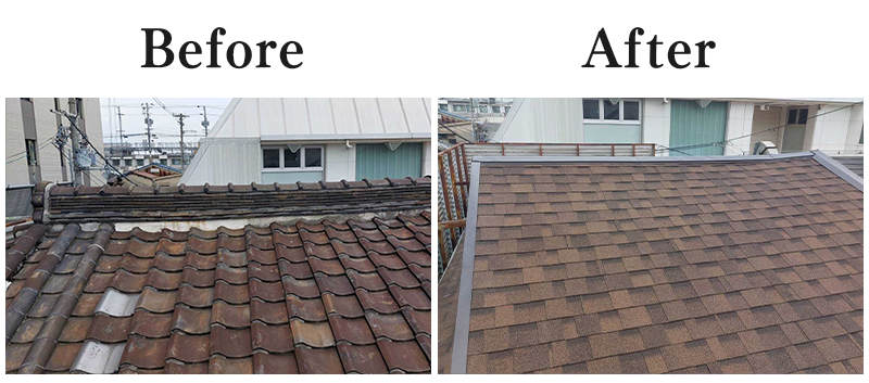 お客様から屋根の軽量化をご相談いただき、土がたっぷり敷き詰めている重い和瓦から、リフォームに最適なファイバーグラスシングル屋根材「オークリッジスーパー」へ葺き替えました。